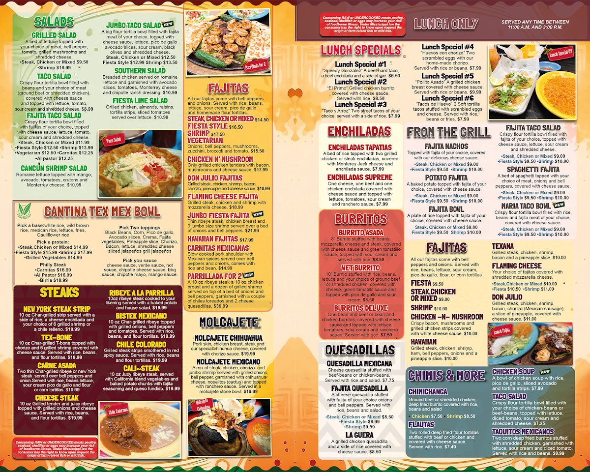 A mix of steak, chicken, chorizo and jumbo shrimp served with grilled onions, bell pepper, garnished with Chihuahua cheese, nopalitos (cactus) and topped with ranchero sauce. Served in a molcajete stone bowl.