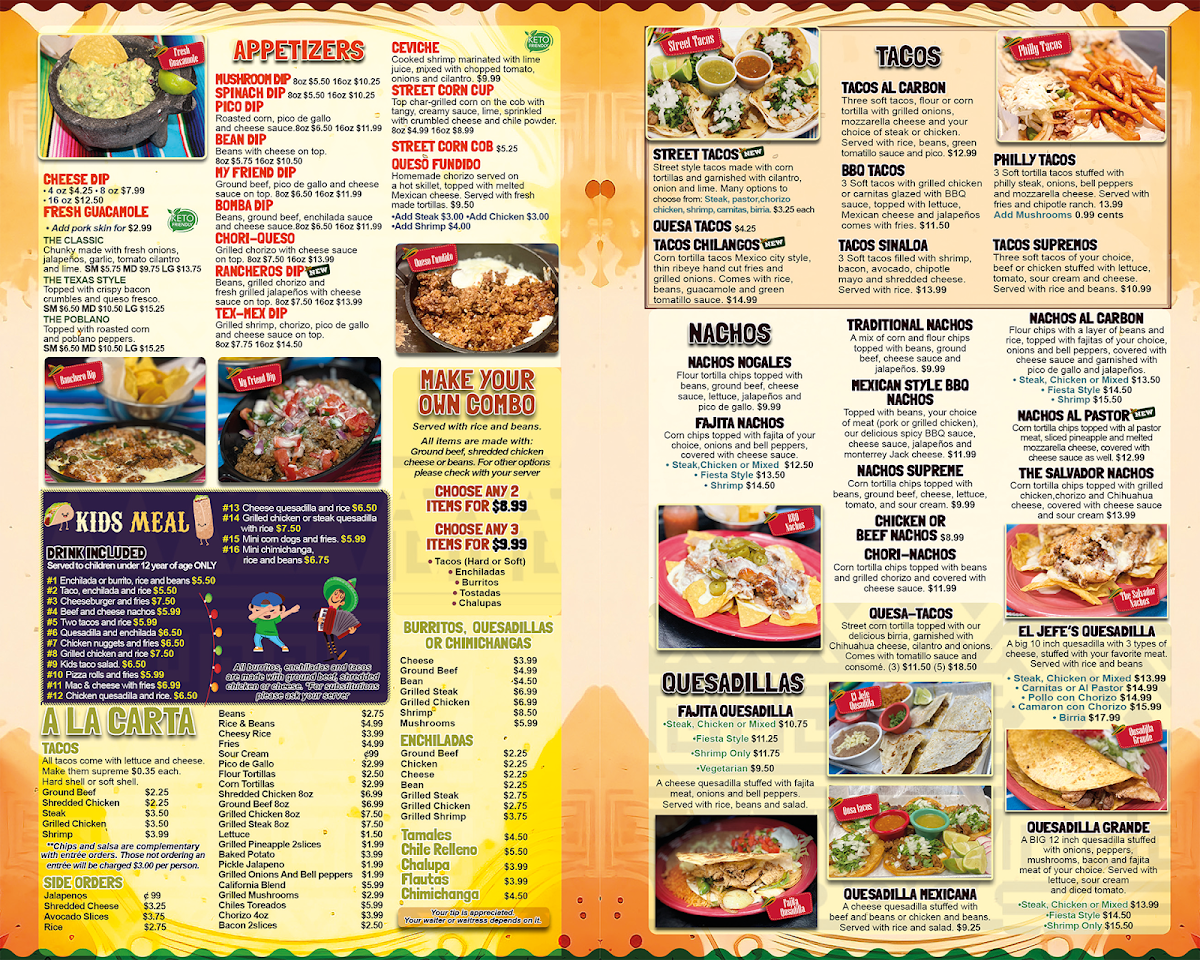 Choose three items and fill them with your choice of protein. Options include tacos, enchiladas, burritos, tostadas, or chalupas. Select from ground beef, shredded chicken, cheese, or beans.