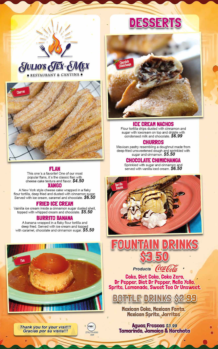 Coke, Diet Coke, Dr Pepper, Mello Yello, Sprite, Lemonade, Sweet or Unsweet Tea.