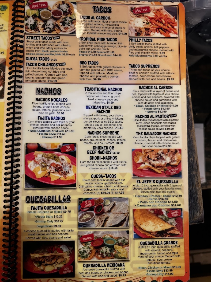 New. A 10 oz ribeye steak, a 10 oz chicken breast and a dozen of grilled shrimp served on top of a bed of onions and bell peppers, garnished with a couple of chiles toreados and 2 cheese quesadillas.