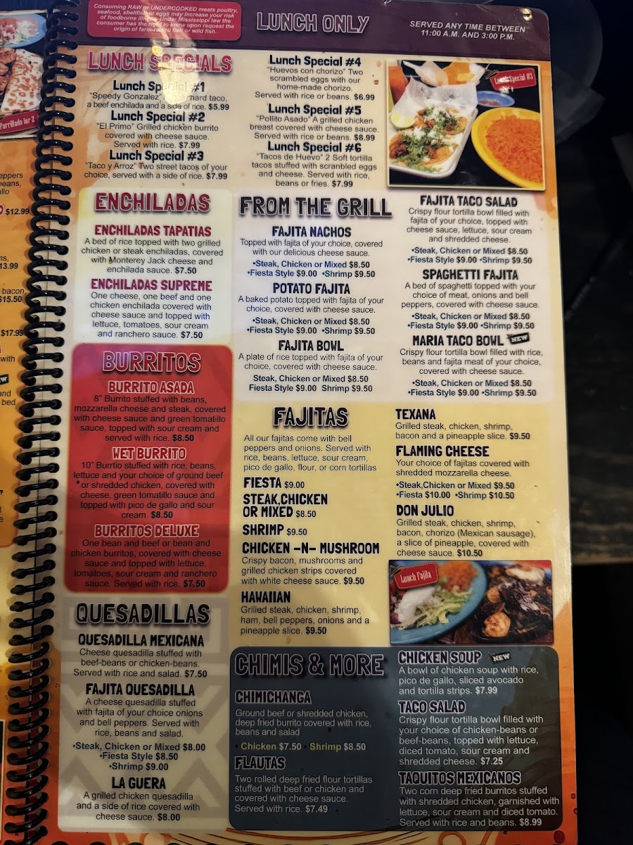 8" burrito stuffed with fajita meat of your choice, covered with cheese sauce and served with rice beans and salad.
